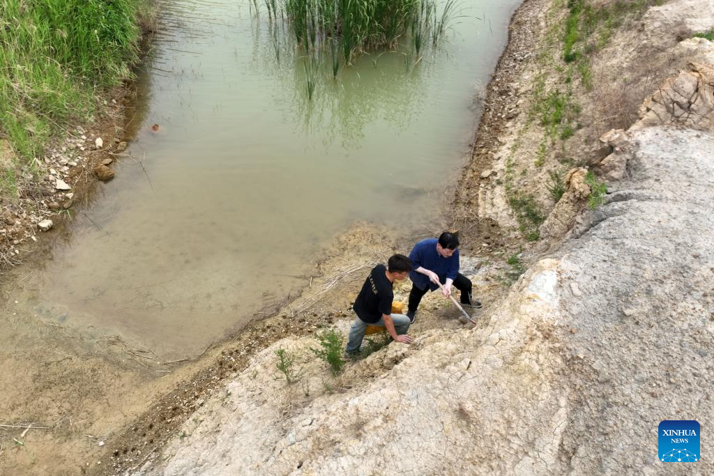 An aerial drone photo taken on June 28, 2025 shows Zhang Zhizhong (R) and a student searching for raw materials for porcelain production in Lincheng County, Xingtai, north China's Hebei Province. (Xinhua/Mu Yu)