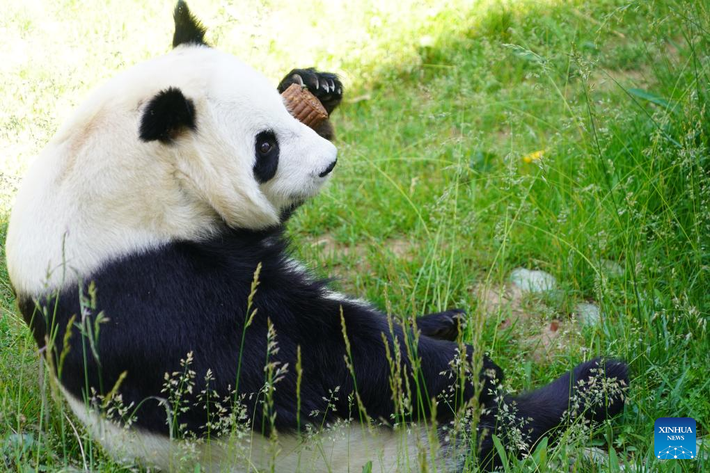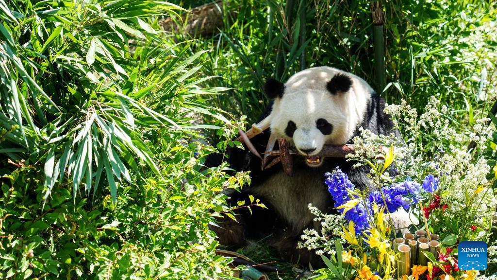 Giant panda Yuan Man eats bamboo at a panda house in Xining, northwest China's Qinghai Province, June 28, 2025. Two giant pandas Qi Guo and Yuan Man enjoy the celebration of their 9th birthday here on Saturday. (Xinhua/Geng Huihuang)