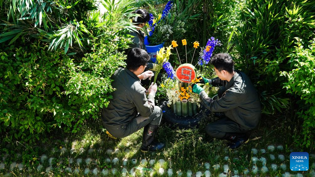 Staff members arrange flowers for the 9th birthday celebration of giant pandas Qi Guo and Yuan Man at a panda house in Xining, northwest China's Qinghai Province, June 28, 2025. Two giant pandas Qi Guo and Yuan Man enjoy the celebration of their 9th birthday here on Saturday. (Xinhua/Wang Yan)