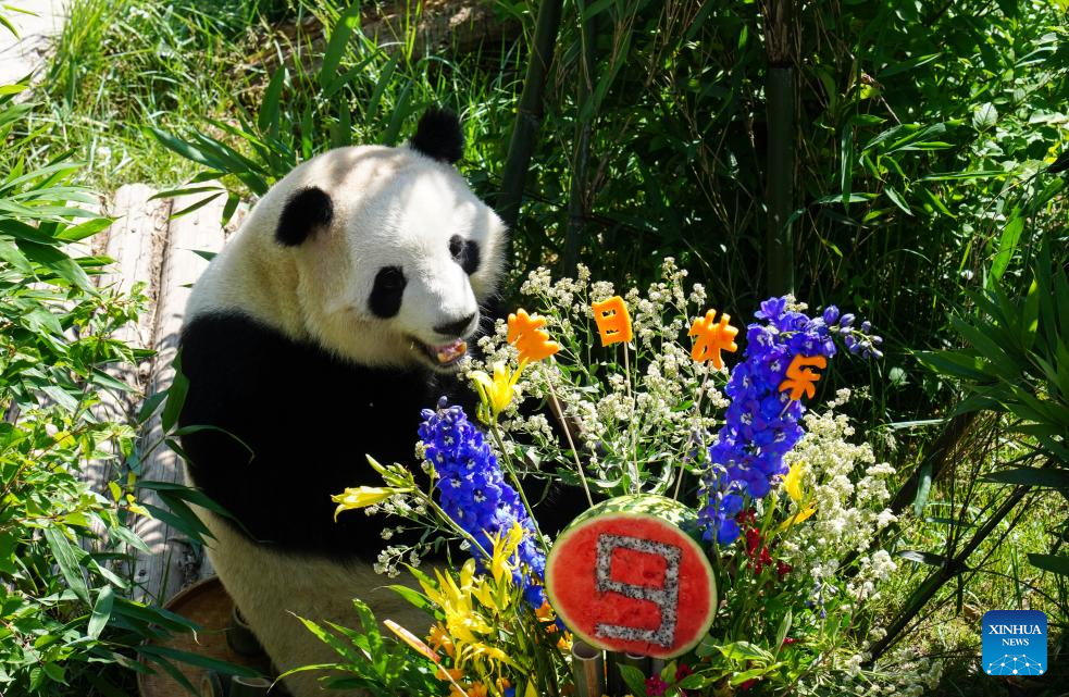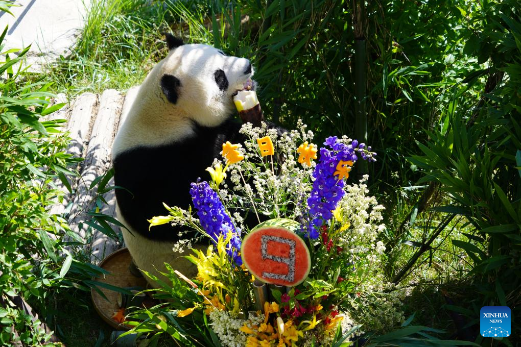 Giant panda Qi Guo enjoys its birthday treat at a panda house in Xining, northwest China's Qinghai Province, June 28, 2025. Two giant pandas Qi Guo and Yuan Man enjoy the celebration of their 9th birthday here on Saturday. (Xinhua/Geng Huihuang)