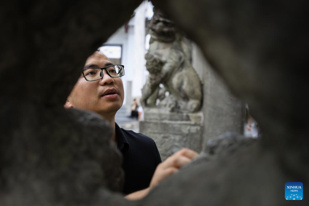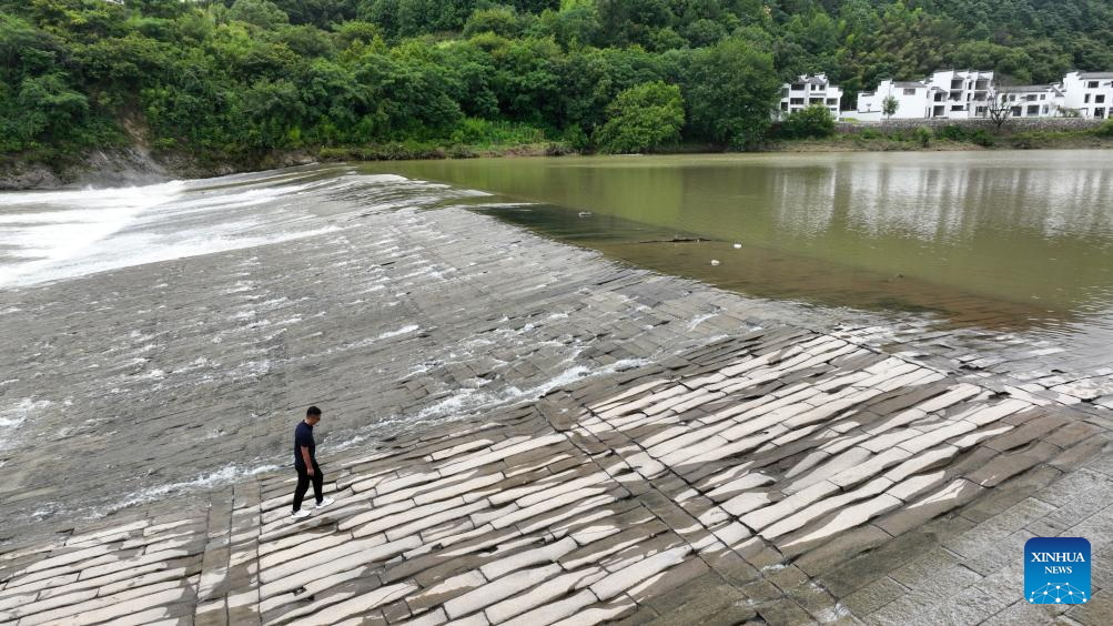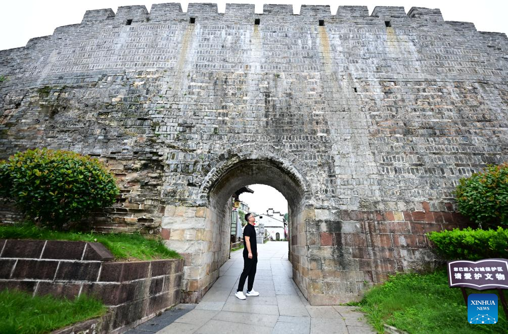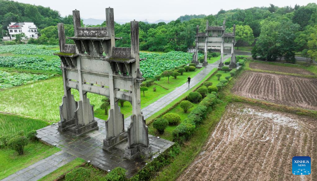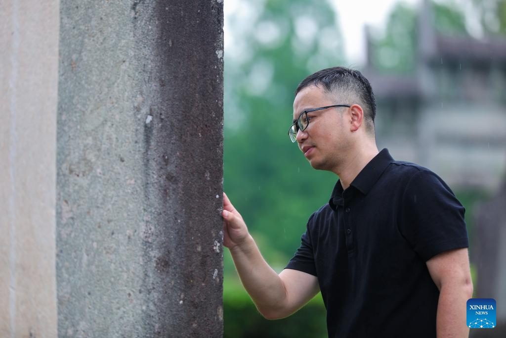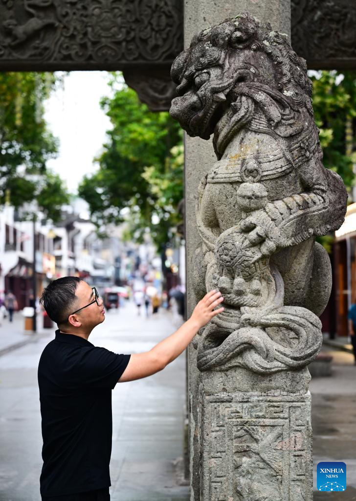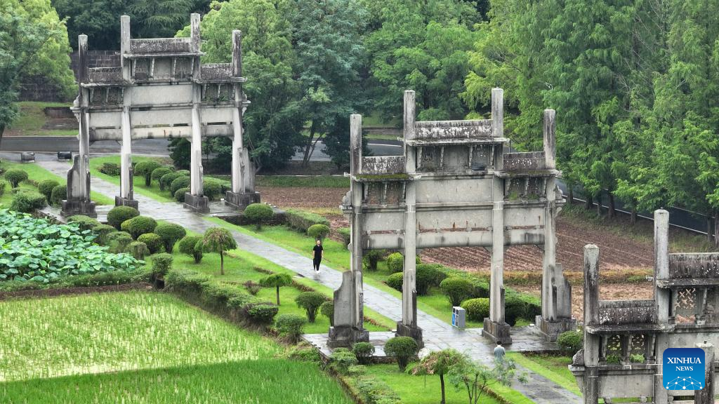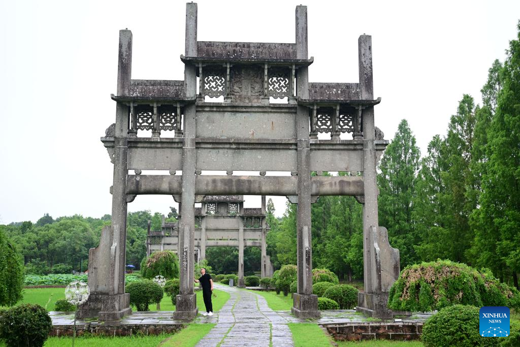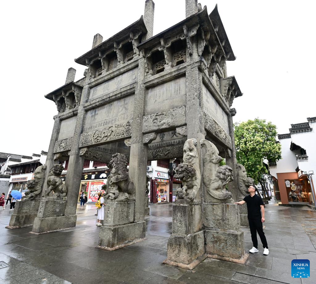 Zhou Hu patrols the Tangyue archway cluster in Shexian County, east China's Anhui Province, June 19, 2025. Shexian County of east China's Anhui Province has carried the essence of Hui-style culture and architecture. In its ancient town, the network of ancient streets, alleys, and bridges is complemented by traditional residences, ancestral halls, and memorial archways.