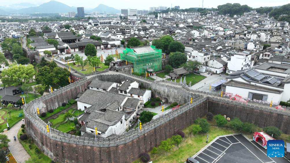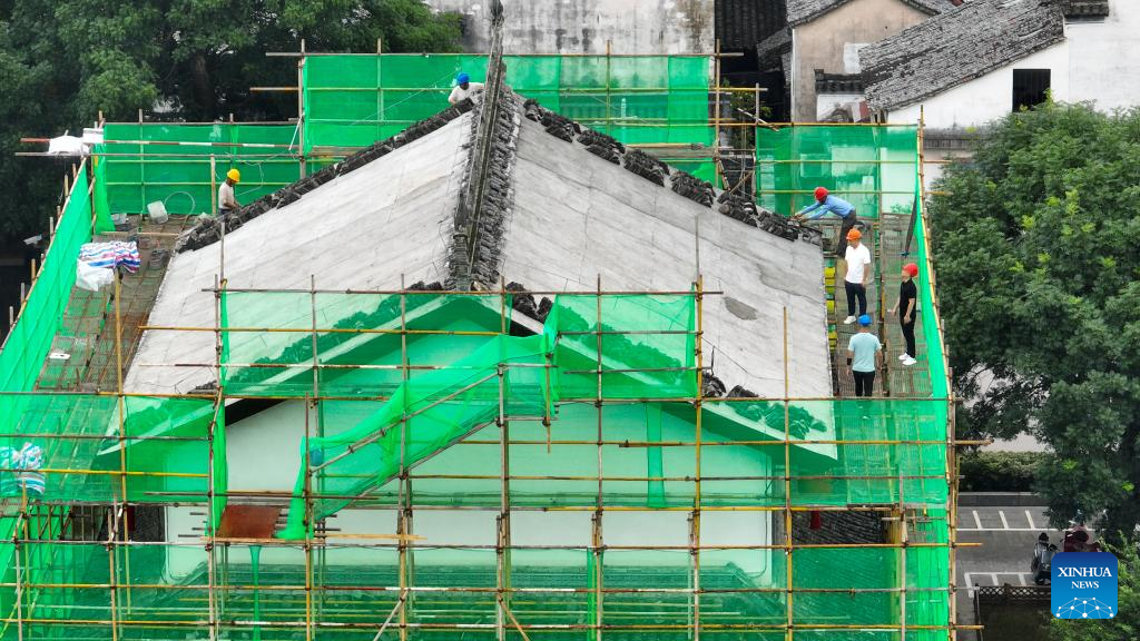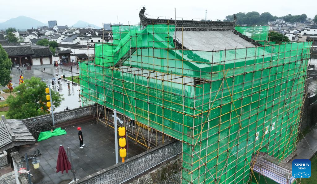 A drone photo taken on June 19, 2025 shows the maintenance project of a watch tower in the Huizhou ancient town in Shexian County, east China's Anhui Province. (Xinhua/Zhou Mu)