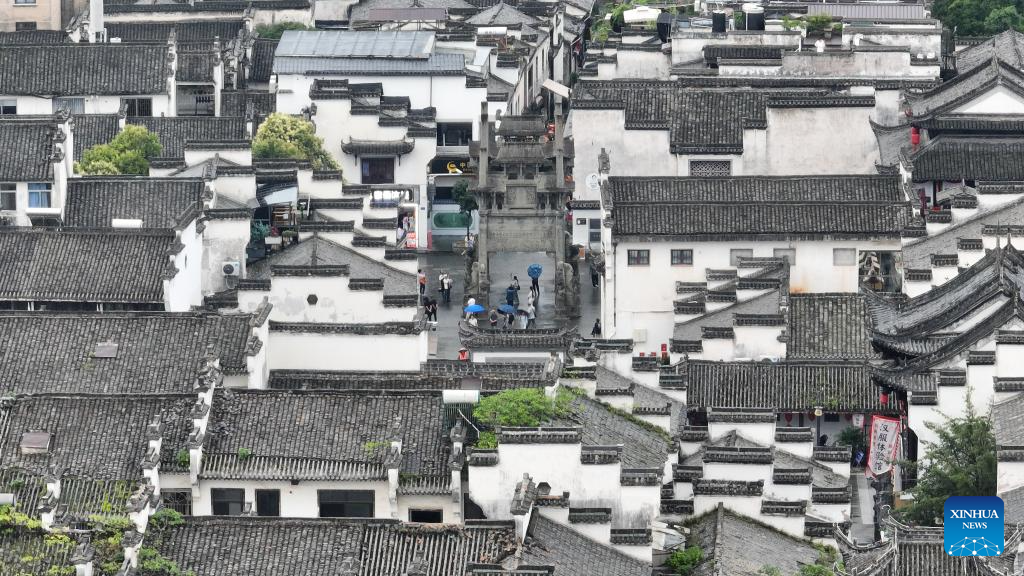 An aerial drone photo taken on June 19, 2025 shows a view of Huizhou ancient town in Shexian County, east China's Anhui Province. (Xinhua/Zhou Mu)