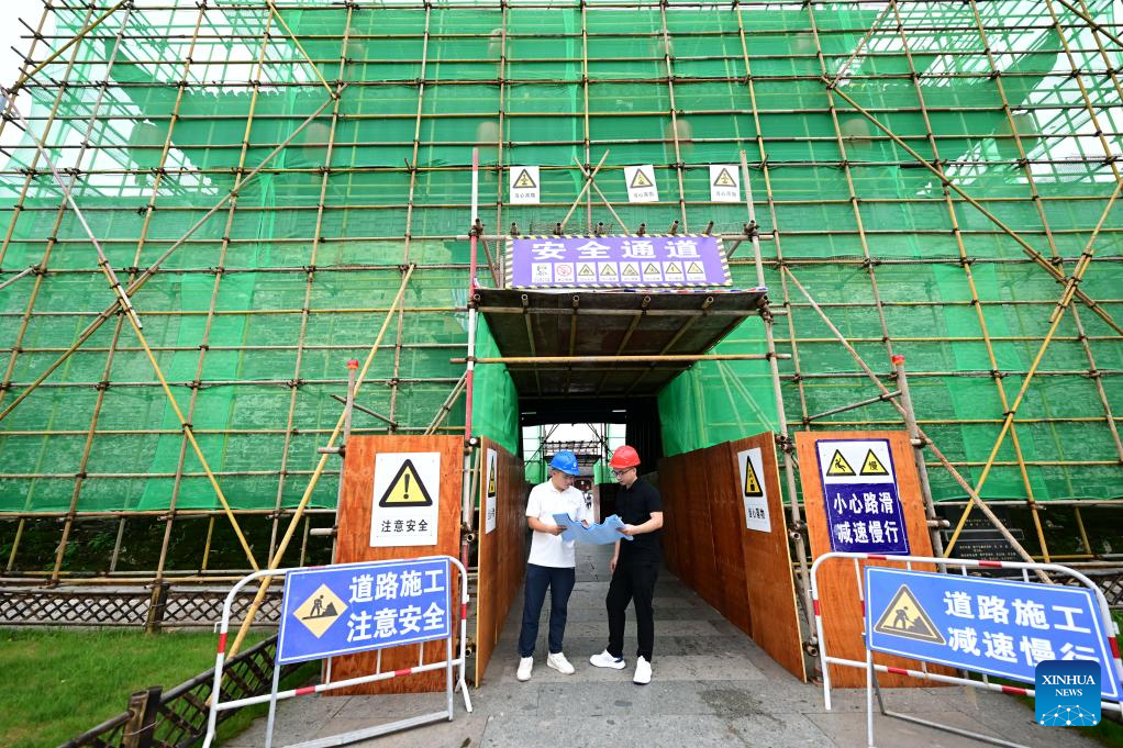 Zhou Hu inspects the maintenance project of a watch tower in the Huizhou ancient town in Shexian County, east China's Anhui Province, June 19, 2025. (Xinhua/Zhou Mu)