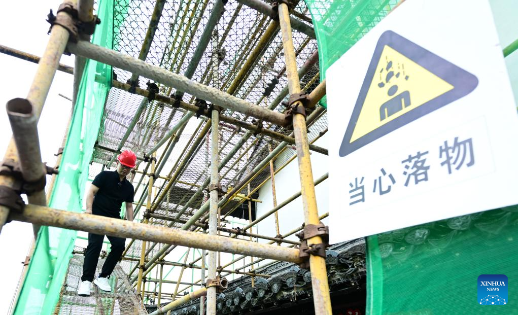 A drone photo taken on June 19, 2025 shows Zhou Hu inspecting the maintenance project of a watch tower in the Huizhou ancient town in Shexian County, east China's Anhui Province. (Xinhua/Zhou Mu)