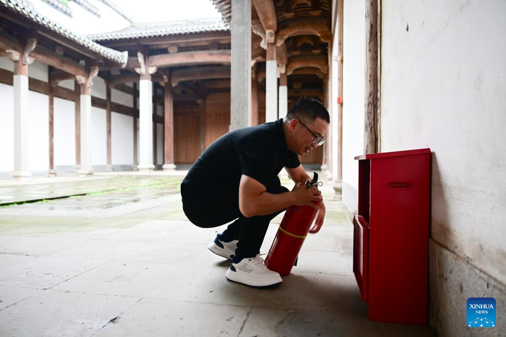 Zhou Hu checks a fire extinguisher at an ancestral hall in Shexian County, east China's Anhui Province on June 19, 2025. (Xinhua/Zhou Mu)