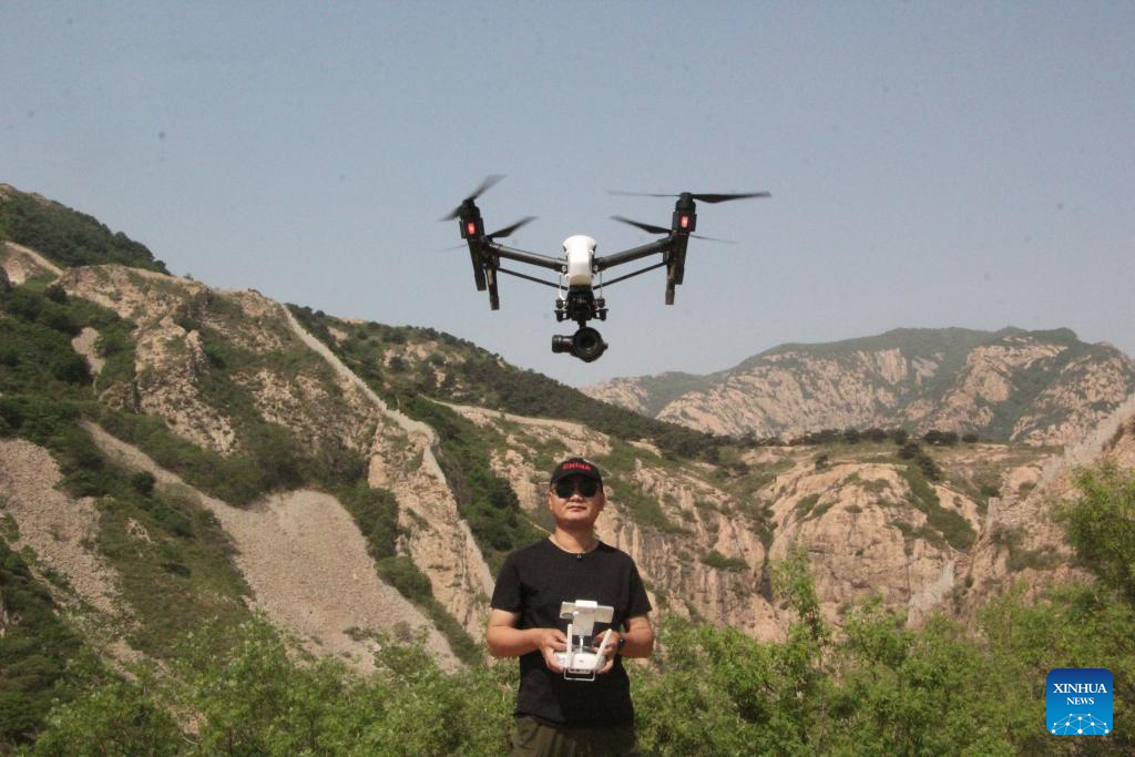 Zhang Peng, a guard of the Great Wall, inspects a section of the Great Wall via a camera-bearing drone in Qinhuangdao, north China's Hebei Province, on May 9, 2024. (Photo by Yu Zhijie/Xinhua)