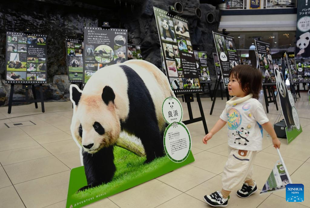 A kid visits a photo exhibition featuring four giant pandas on loan to the Adventure World amusement park in Shirahama, Wakayama prefecture, Japan, June 27, 2025. (Xinhua/Jia Haocheng)