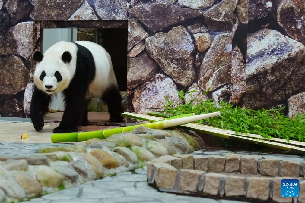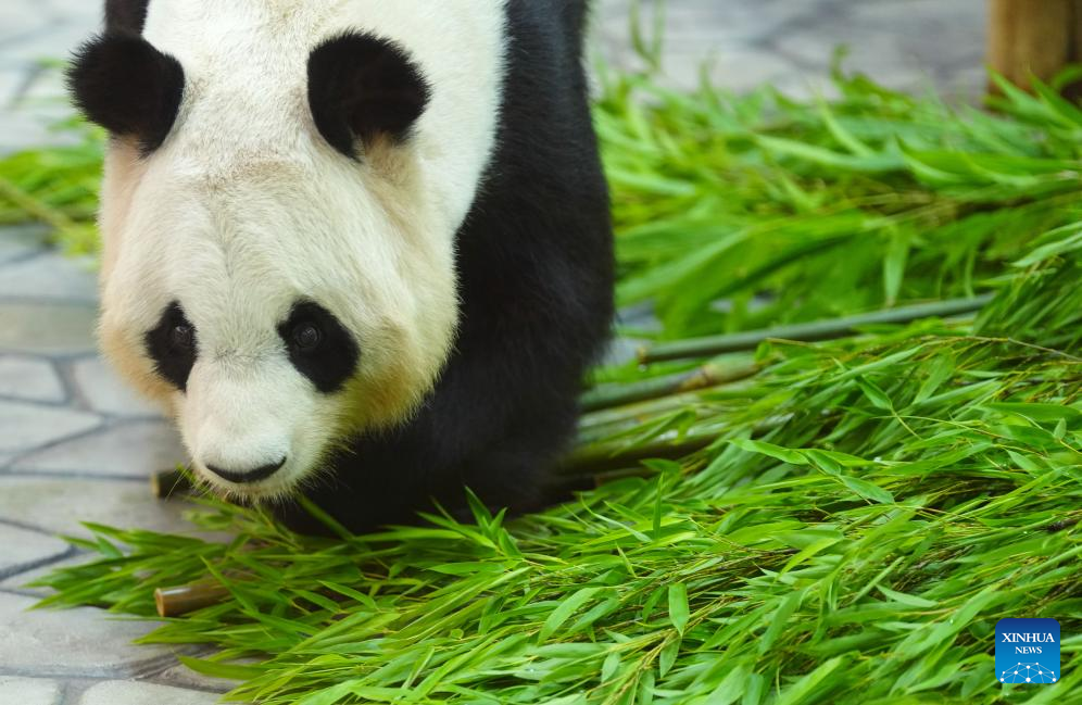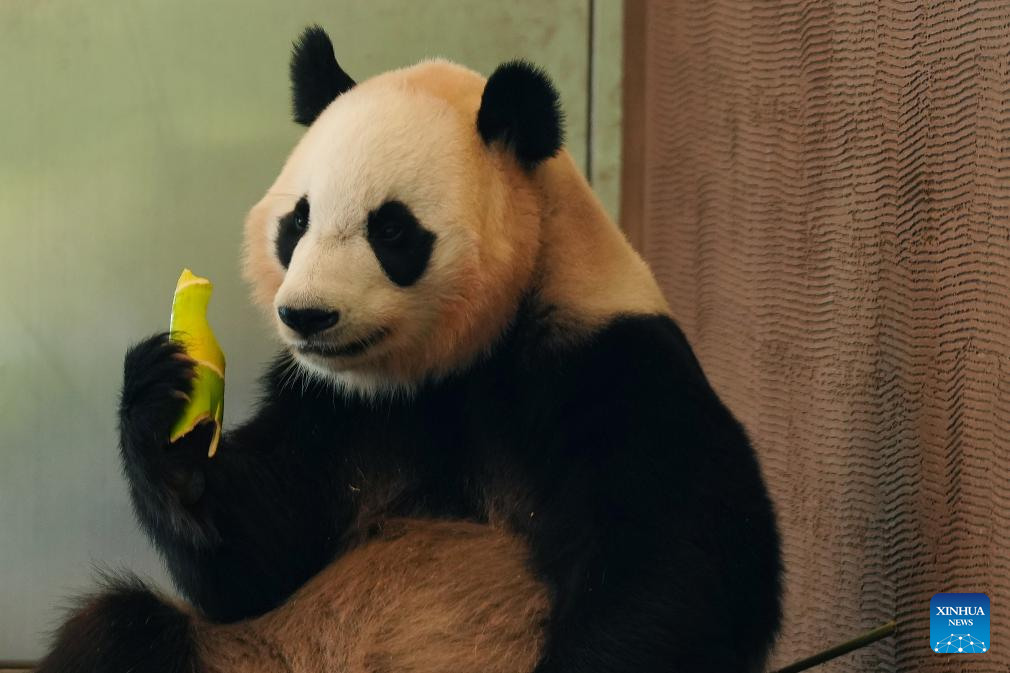 Giant panda Rauhin eats at Adventure World amusement park in Shirahama, Wakayama prefecture, Japan, June 27, 2025. (Xinhua/Jia Haocheng)