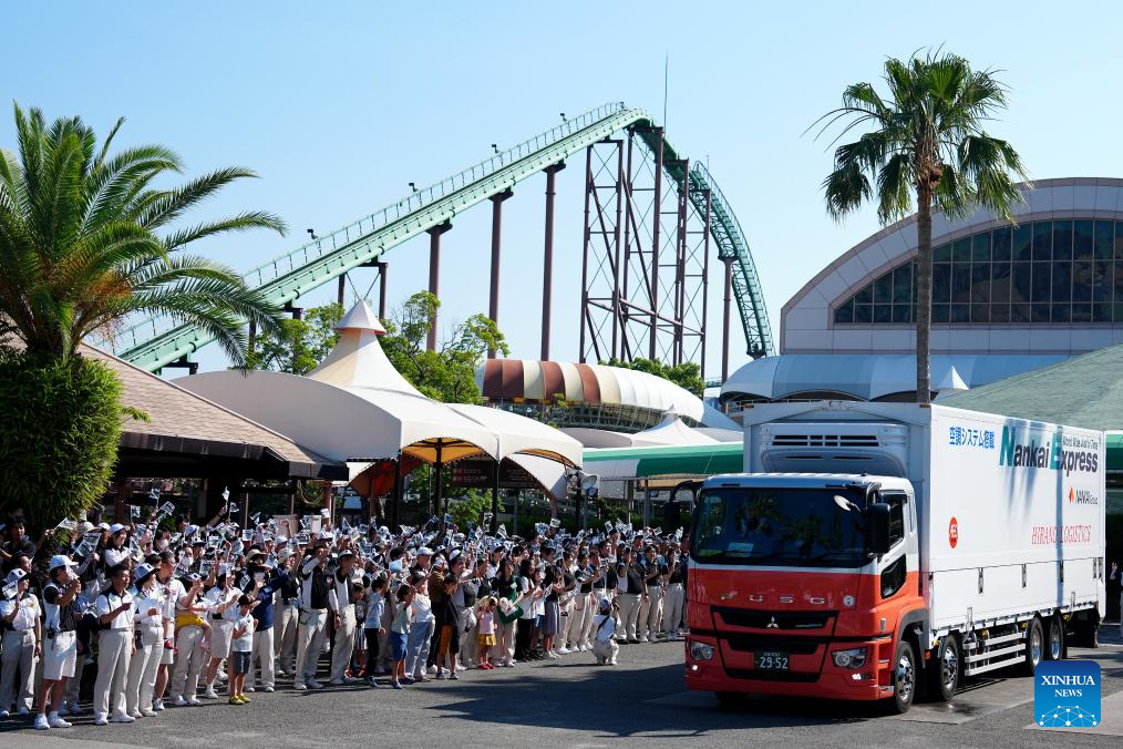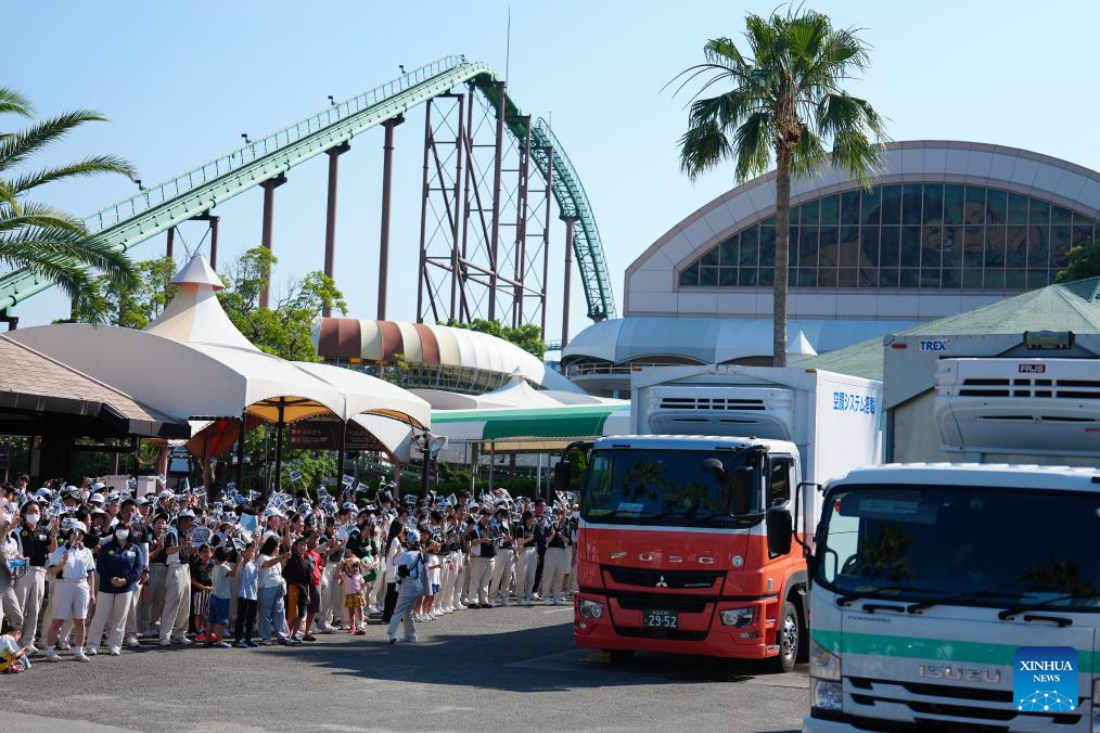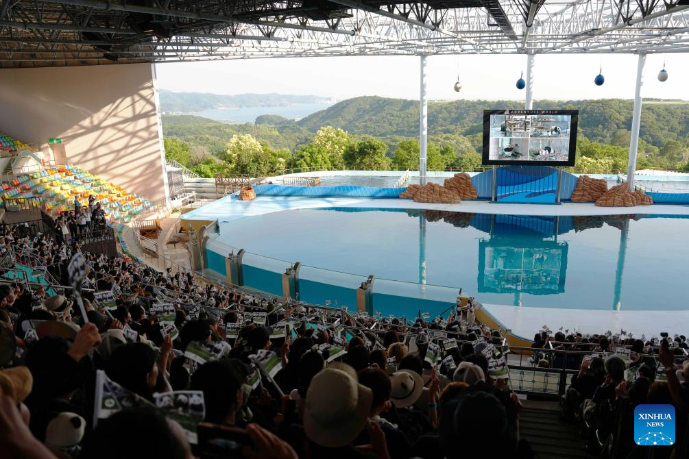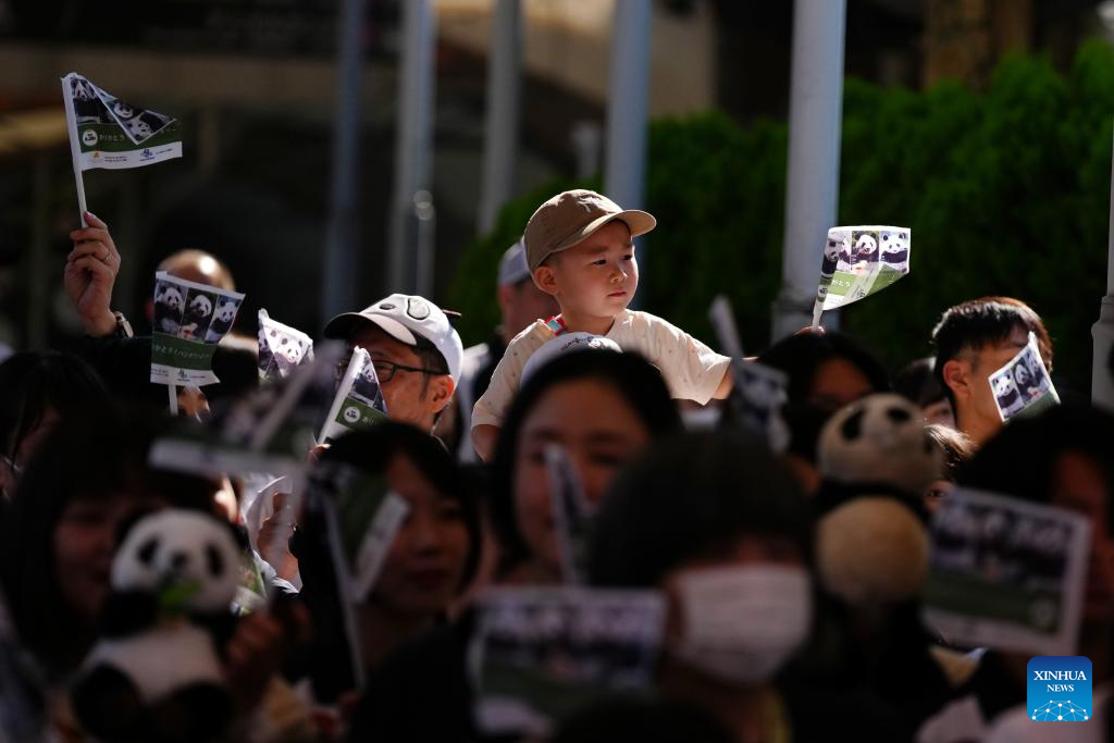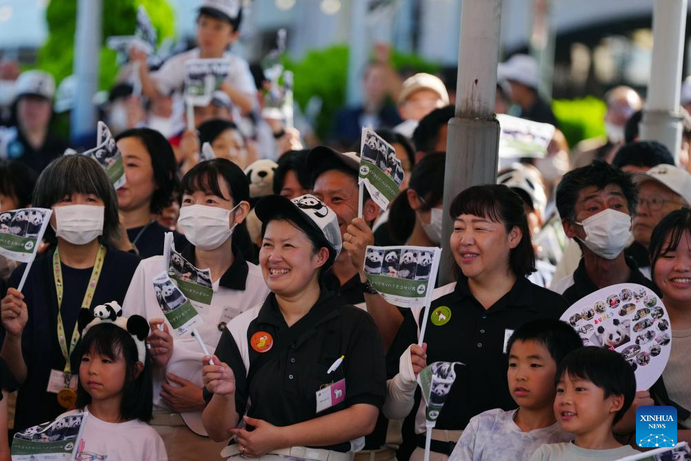Tourists wave goodbye to giant pandas during a farewell ceremony at Adventure World amusement park in Shirahama, Wakayama prefecture, Japan, June 27, 2025. (Xinhua/Jia Haocheng)