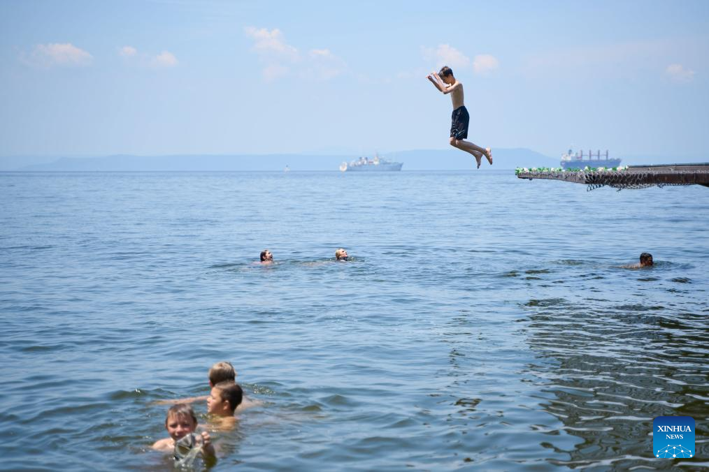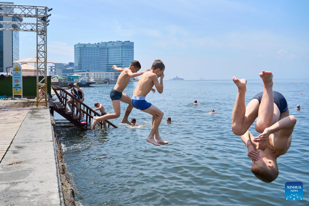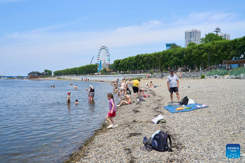 Local residents relax at the beach to escape the heat in Vladivostok, Russia, June 27, 2025. Vladivostok experienced a severe heat wave on Friday. (Photo by Guo Feizhou/Xinhua)