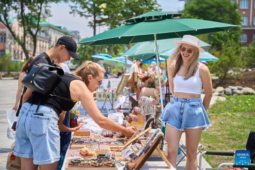 Tourists shop for souvenirs on the street in Vladivostok, Russia, June 27, 2025. Vladivostok experienced a severe heat wave on Friday. (Photo by Guo Feizhou/Xinhua)