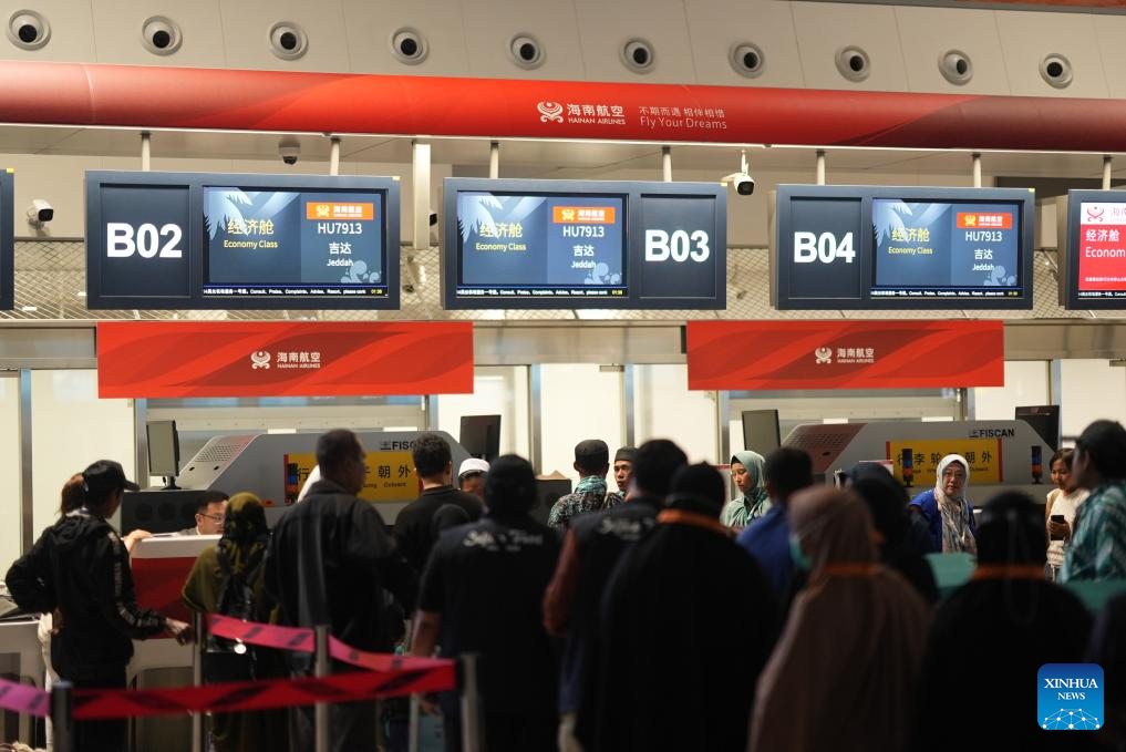 Passengers for the flight from Haikou to Jeddah line up to check in at Haikou Meilan International Airport in Haikou, south China's Hainan Province, June 28, 2025. (Hainan Airlines/Handout via Xinhua)