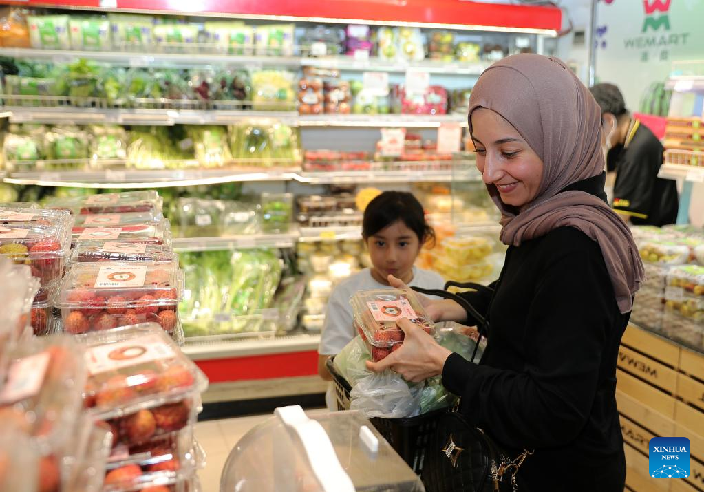 A consumer selects lychees at a supermarket in Dubai, the United Arab Emirates (UAE), June 20, 2025.