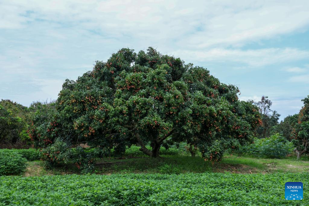 A lychee tree laden with lychee fruits is pictured at an orchard in Gaozhou City, south China's Guangdong Province, June 5, 2025.