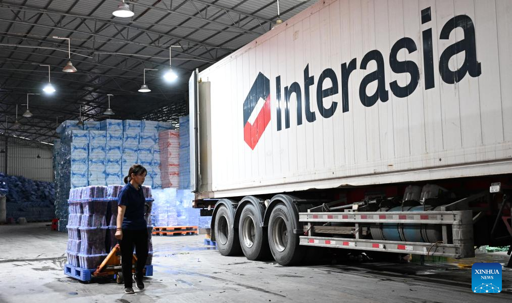 A staff member transports packed lychees for export at a company in Gaozhou City, south China's Guangdong Province, June 4, 2025.