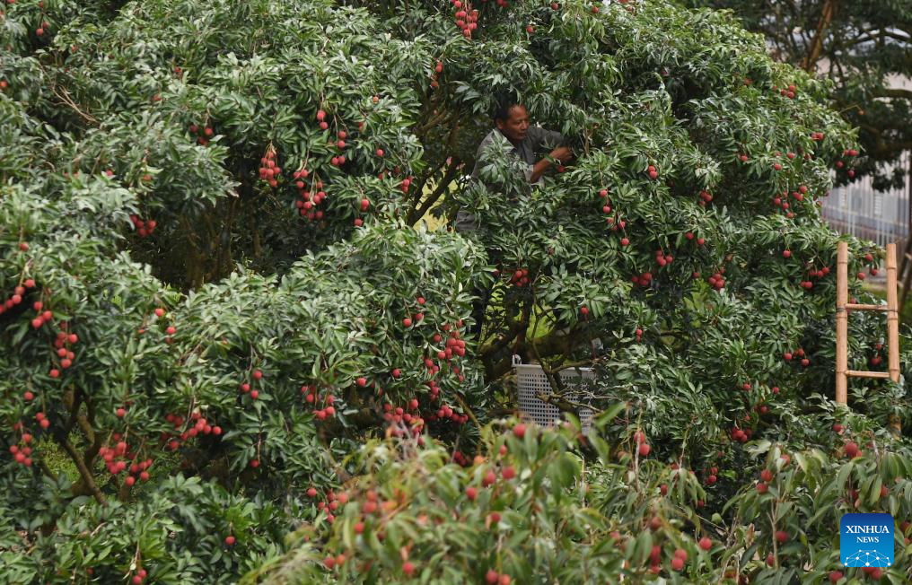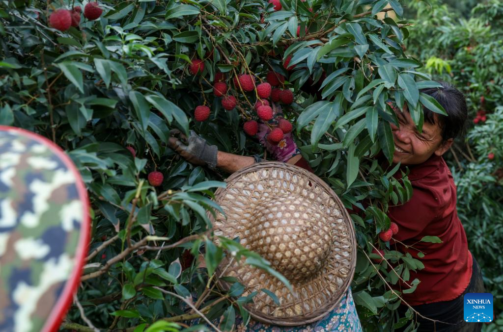 Farmers pick lychees at an orchard in Gaozhou City, south China's Guangdong Province, June 5, 2025.