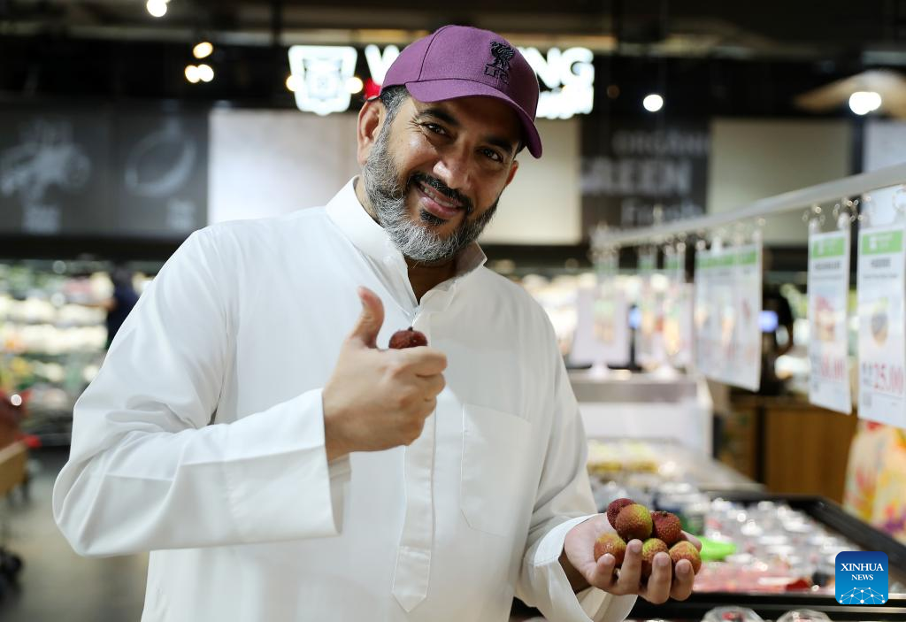 A consumer gives a thumb up after tasting a lychee at a supermarket in Dubai, the United Arab Emirates (UAE), June 21, 2025.