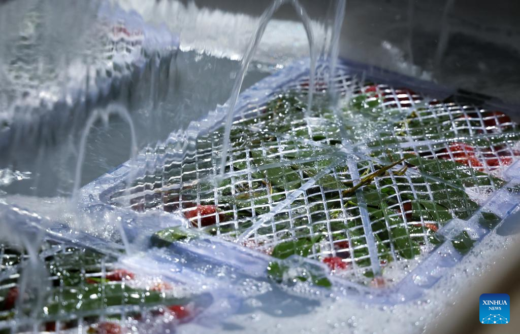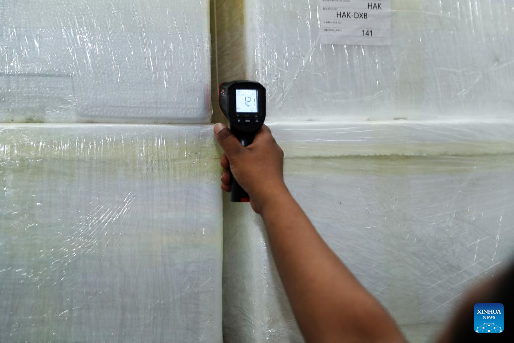 A staff member measures the temperature of a box of lychees newly arrived by air at the warehouse of a supermarket in Duabi, the United Arab Emirates (UAE), June 20, 2025.
