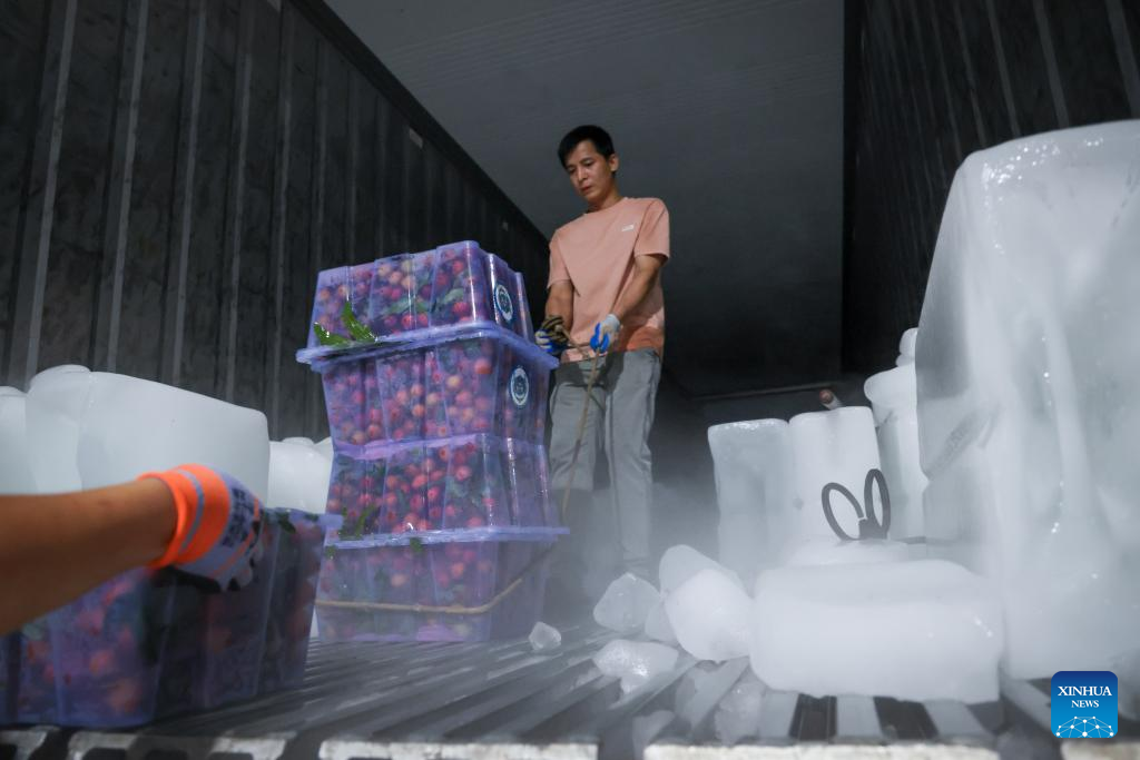 Workers load boxes of lychees onto a cold-chain truck with ice at a company in Gaozhou City, south China's Guangdong Province, June 4, 2025.
