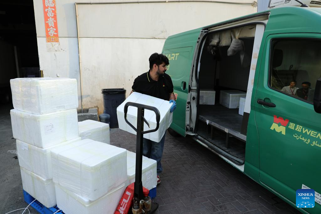 A staff member loads boxes of lychees newly arrived by air onto a car at the warehouse of a supermarket in Dubai, the United Arab Emirates (UAE), June 20, 2025.