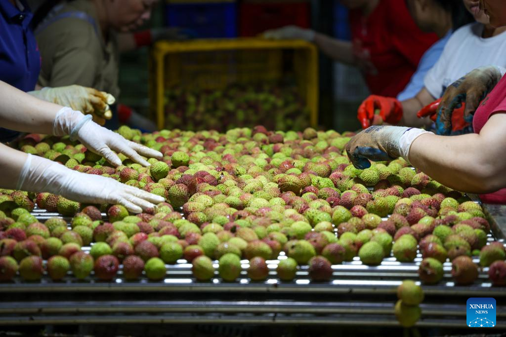 Workers select lychees for export at a company in Gaozhou City, south China's Guangdong Province, June 4, 2025.