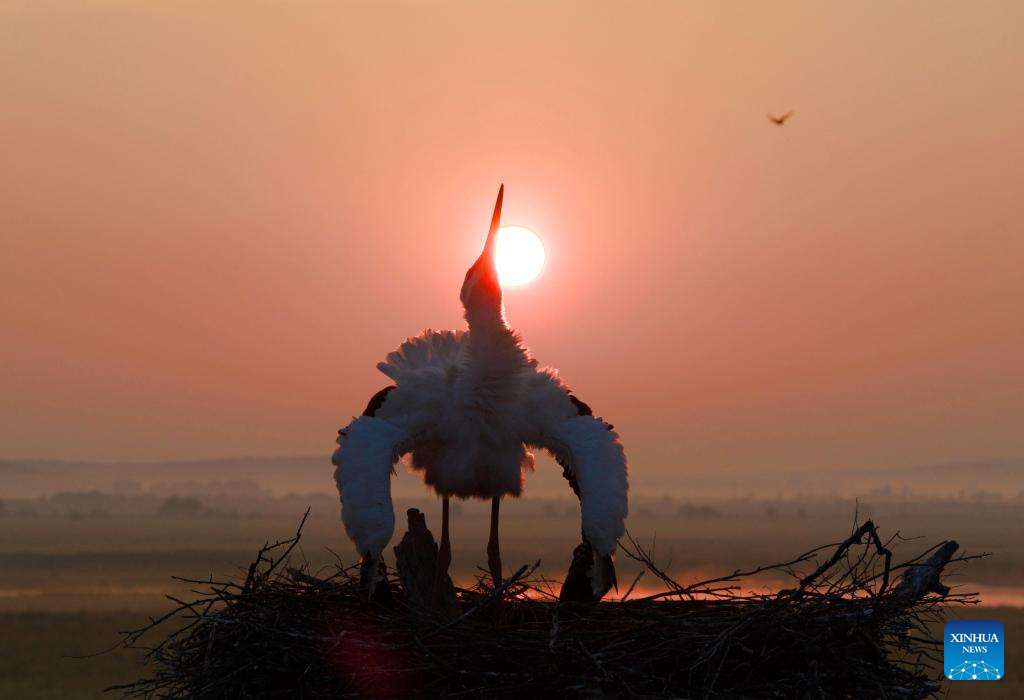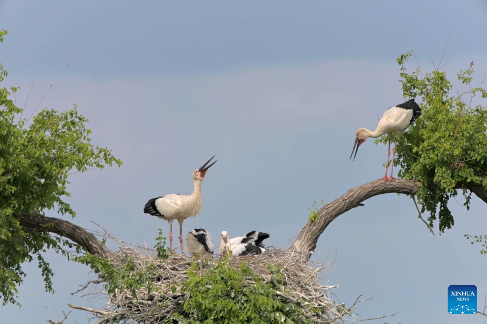 An oriental white stork family is seen at the Zhalong National Nature Reserve in Qiqihar, northeast China's Heilongjiang Province, June 9, 2025. As summer progresses, the breeding season of oriental white storks is gradually coming to an end. The growing chicks begin to learn how to fly under the guidance of their parents.