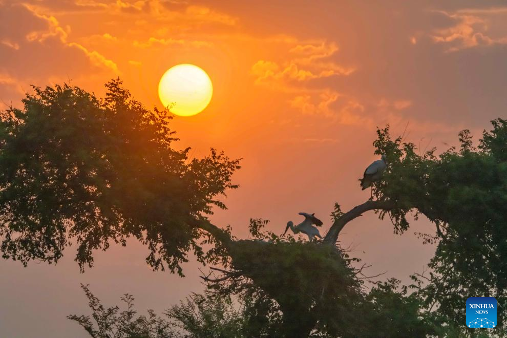 An aerial drone photo taken on June 24, 2025 shows oriental white stork chicks at the Bachadao National Nature Reserve in Tongjiang, northeast China's Heilongjiang Province. As summer progresses, the breeding season of oriental white storks is gradually coming to an end. The growing chicks begin to learn how to fly under the guidance of their parents.