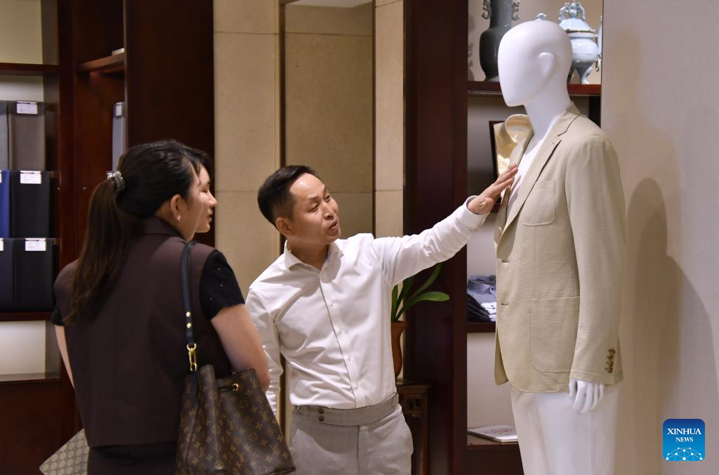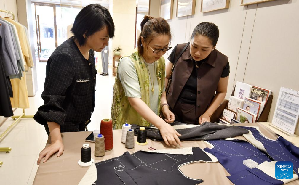 Customers learn about making procedures of customized western-style clothes at the flagship store of Longqingxiang in Beijing, capital of China, June 10, 2025.