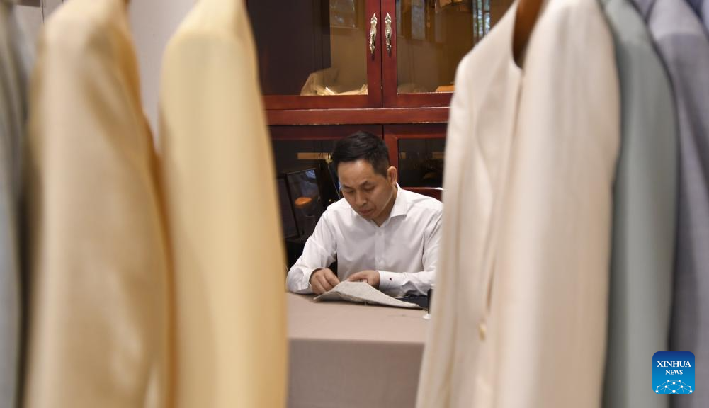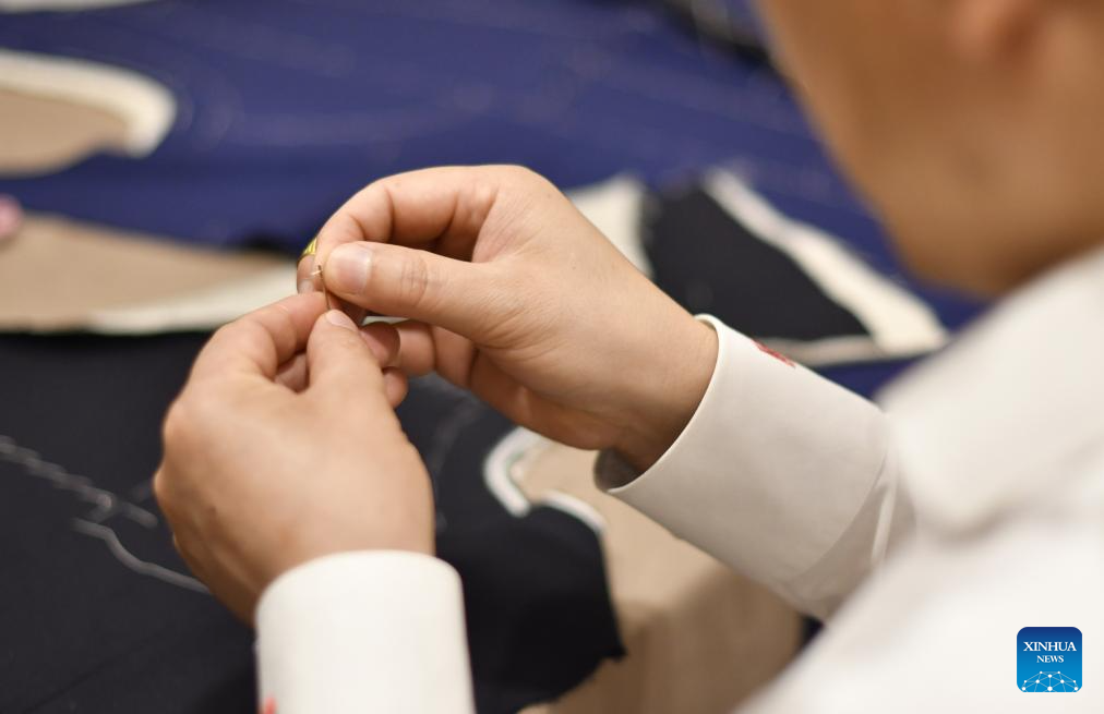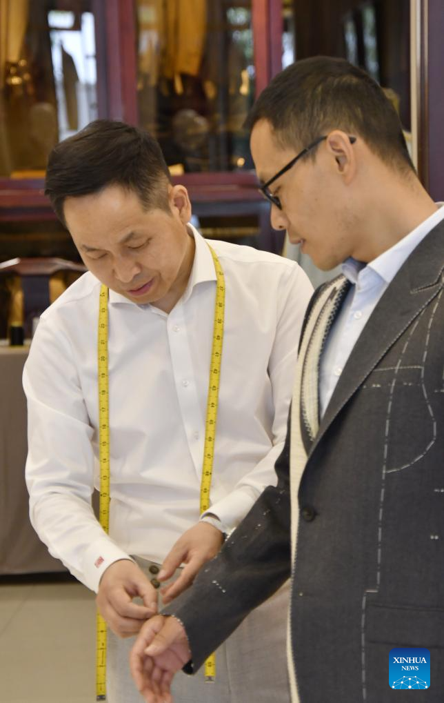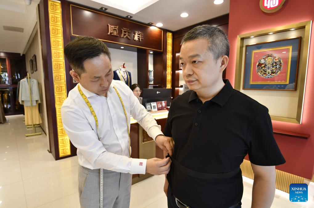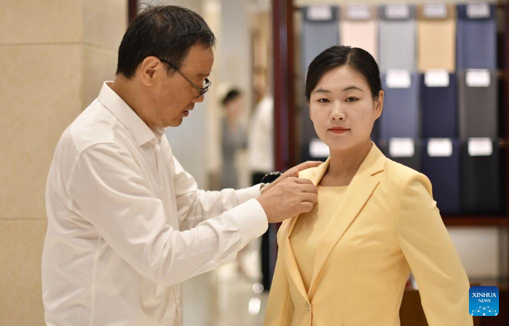 A senior tailor adjusts a set of customized sample clothes at the flagship store of Longqingxiang in Beijing, capital of China, June 24, 2025. (Xinhua/Li Xin)