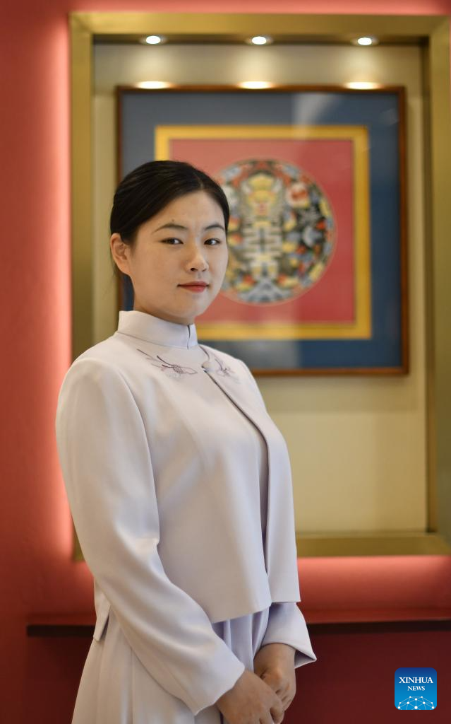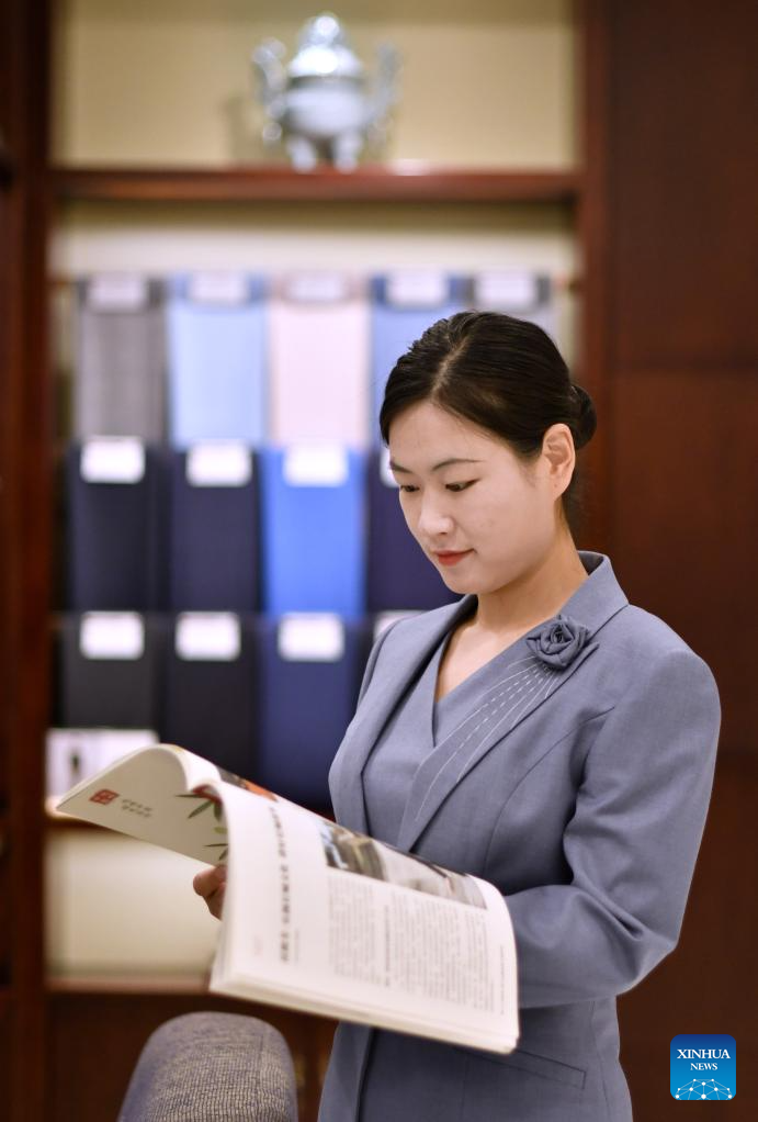 A staff member displays a set of customized sample dress at the flagship store of Longqingxiang in Beijing, capital of China, June 24, 2025. (Xinhua/Li Xin)