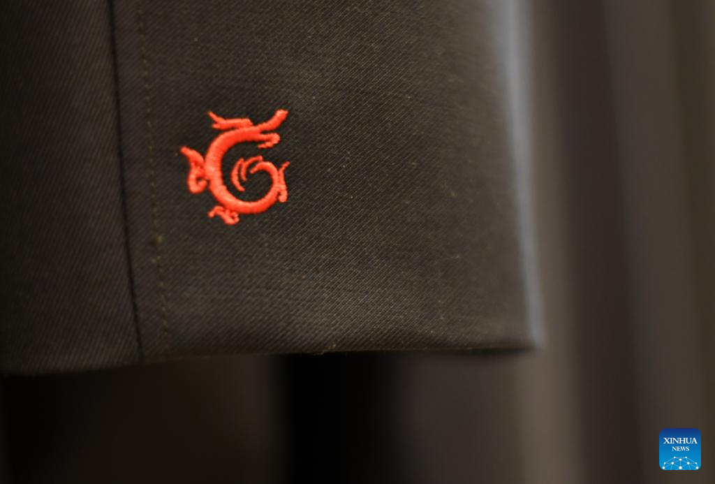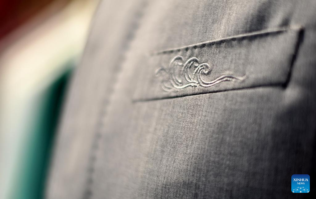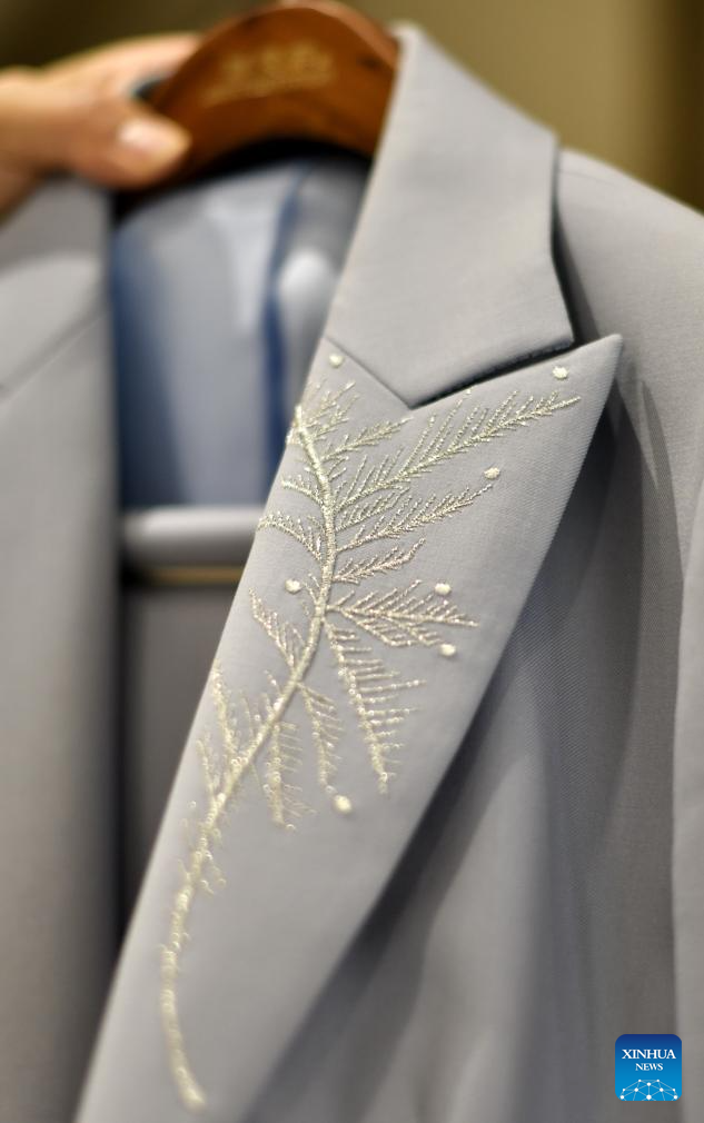 This photo taken on June 24, 2025 shows an embroidered pattern on a set of customized western-style clothes displayed at the flagship store of Longqingxiang in Beijing, capital of China. (Xinhua/Li Xin)