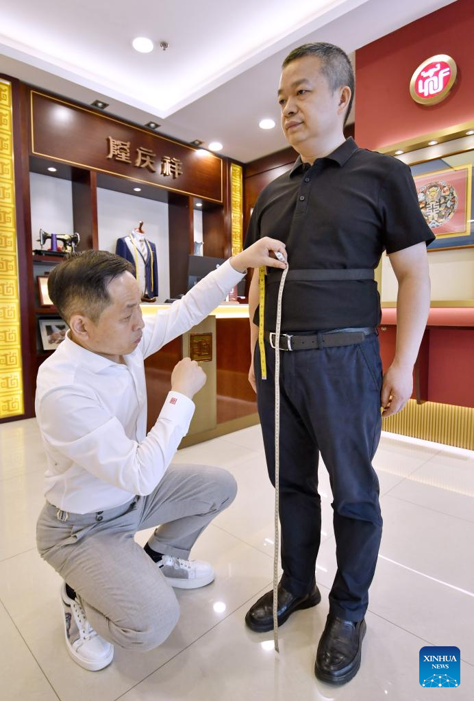 Li Wei measures the body sizes for a customer at the flagship store of Longqingxiang in Beijing, capital of China, June 10, 2025. (Xinhua/Li Xin)