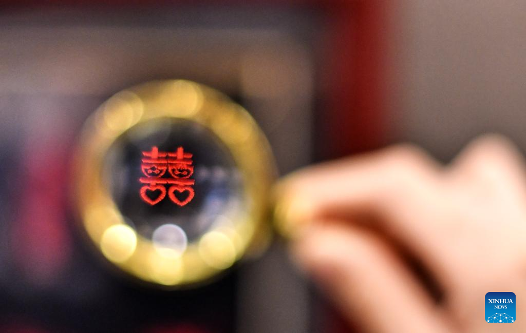 This photo taken on June 10, 2025 shows an embroidered Chinese character "Xi", which means happiness, for customized clothes displayed at the flagship store of Longqingxiang in Beijing, capital of China. (Xinhua/Li Xin)