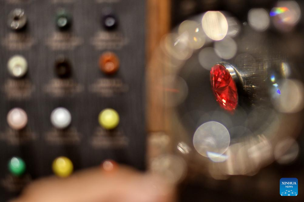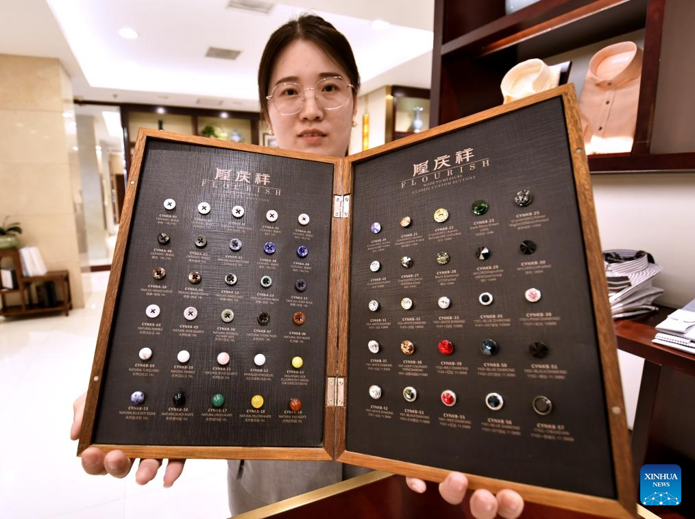 A staff member shows customized buttons at the flagship store of Longqingxiang in Beijing, capital of China, June 10, 2025. (Xinhua/Li Xin)