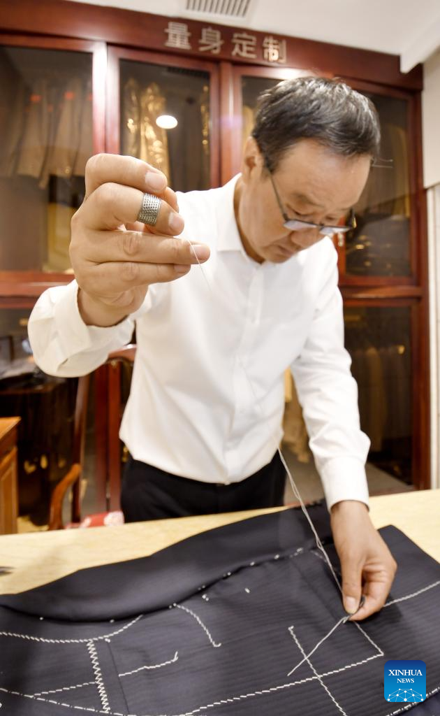 Li Wei sews a set of western-style clothes at the flagship store of Longqingxiang in Beijing, capital of China, June 10, 2025. (Xinhua/Li Xin)