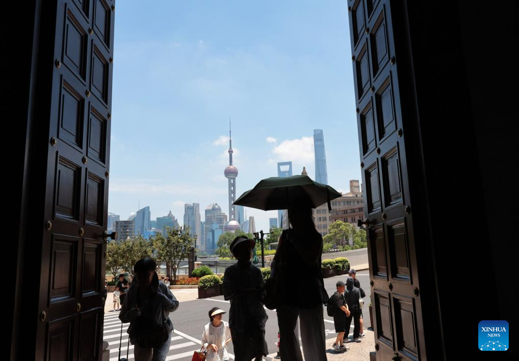 Visitors walk into a museum in Shanghai, east China, June 29, 2025. Shanghai issued a heatwave alert on Sunday, which will last for about 10 days with high temperature hitting 39-40 degrees Celsius. (Xinhua/Fang Zhe)