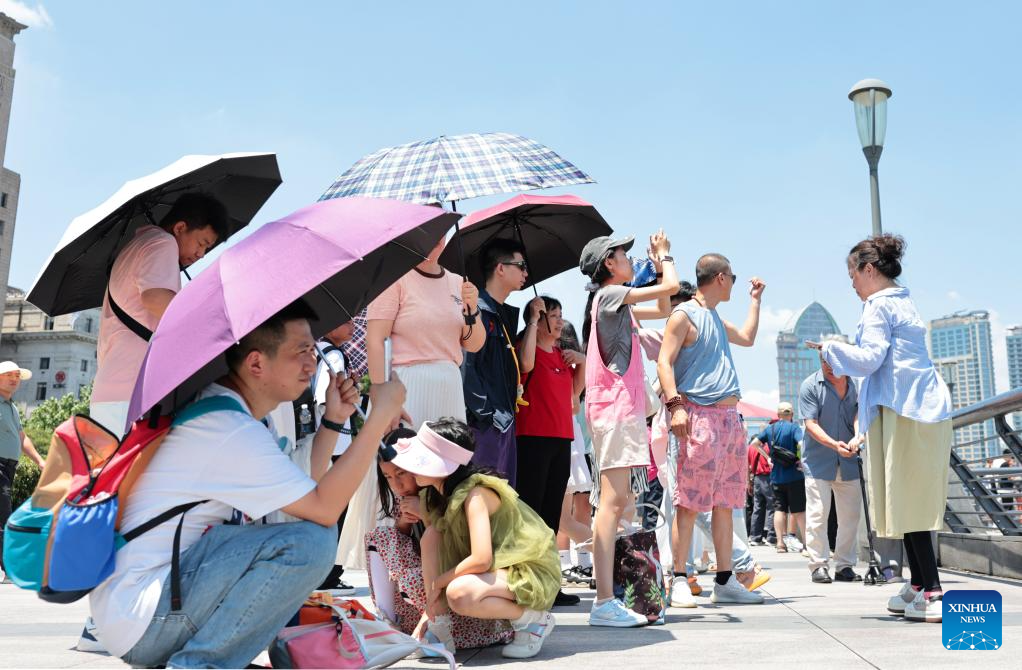 Tourists visit the Bund area in Shanghai, east China, June 29, 2025. Shanghai issued a heatwave alert on Sunday, which will last for about 10 days with high temperature hitting 39-40 degrees Celsius. (Xinhua/Fang Zhe)