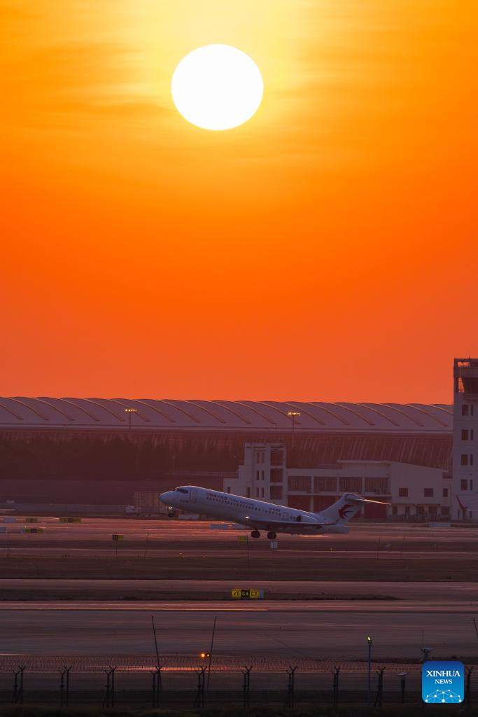This file photo taken on June 28, 2016 shows the first C909 jetliner beginning commercial operation at Chengdu Shuangliu International Airport in Chengdu, southwest China's Sichuan Province,. Saturday marks the ninth anniversary of the commercial operation of China's domestically developed regional jetliner C909. So far, 166 C909 aircraft have been delivered, which have handled over 24 million passenger trips. (Xinhua/Ding Ting)