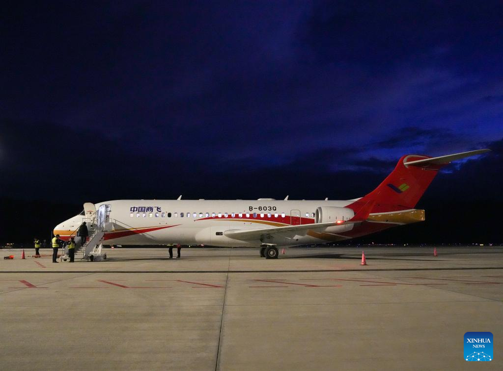 A C909 jetliner is parked at Lhasa Gonggar International Airport in Lhasa, southwest China's Xizang Autonomous Region, Sept. 21, 2024. Saturday marks the ninth anniversary of the commercial operation of China's domestically developed regional jetliner C909. So far, 166 C909 aircraft have been delivered, which have handled over 24 million passenger trips. (Xinhua/Ding Ting)