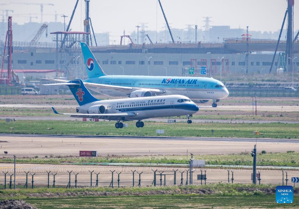 A C909 jetliner (front) of the China Southern Airlines lands at Shanghai Pudong International Airport in Shanghai, east China, April 15, 2025. Saturday marks the ninth anniversary of the commercial operation of China's domestically developed regional jetliner C909. So far, 166 C909 aircraft have been delivered, which have handled over 24 million passenger trips. (Photo by Xu Bingnan/Xinhua)