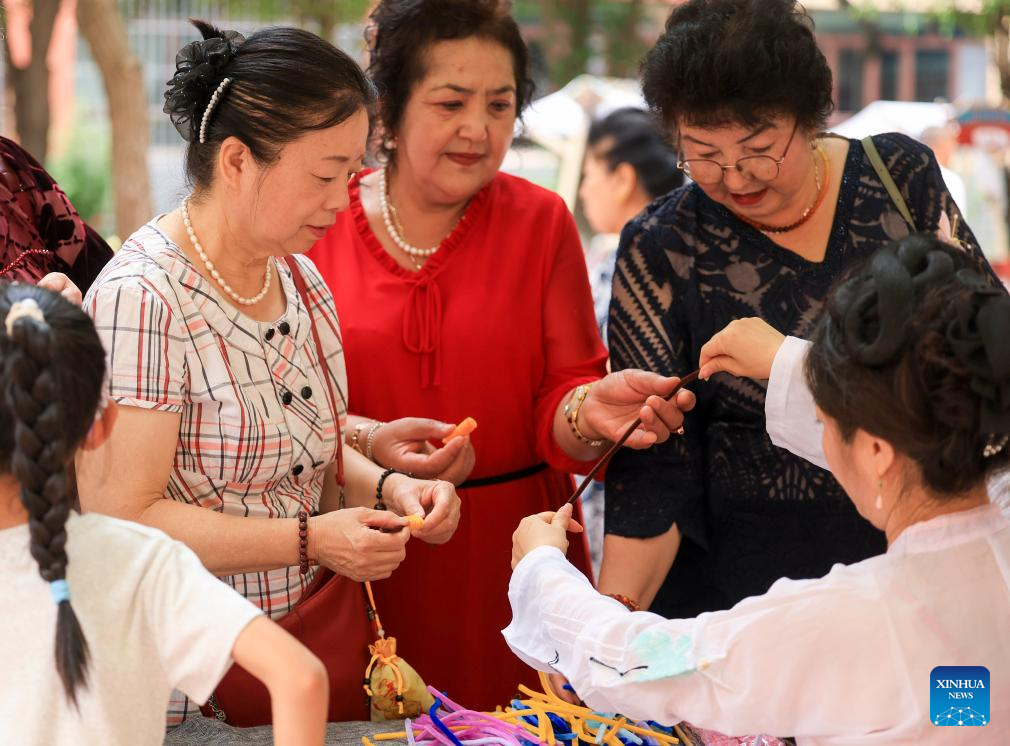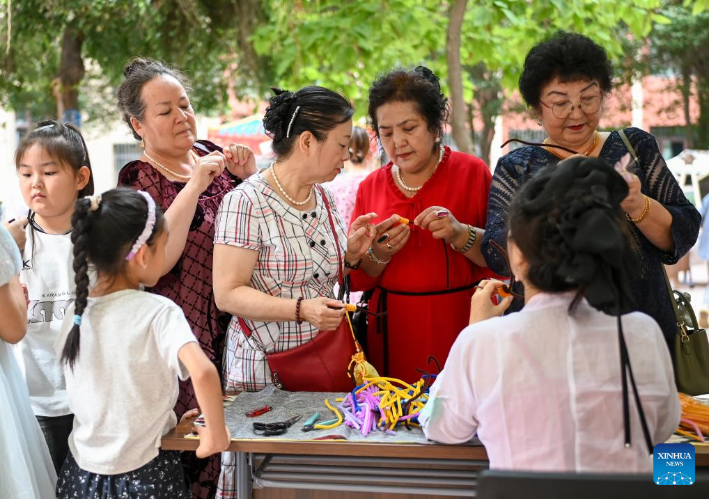 Residents participate in an intangible heritage activity at Xinjiang Open University for Seniors in Urumqi, northwest China's Xinjiang Uygur Autonomous Region, June 27, 2025. A graduation ceremony was held at Xinjiang Open University for Seniors on Friday to celebrate the graduation of its students. The event offered a stage for the elderly students to show their learning achievements, which also attracted their relatives, friends and local residents to take part in with various cultural activities.