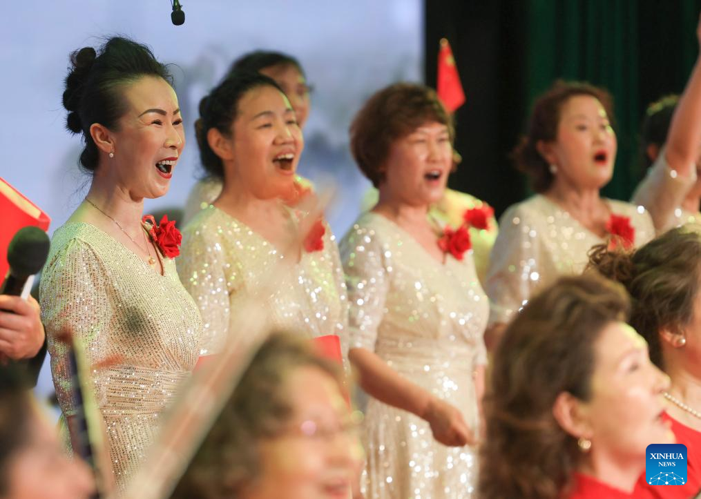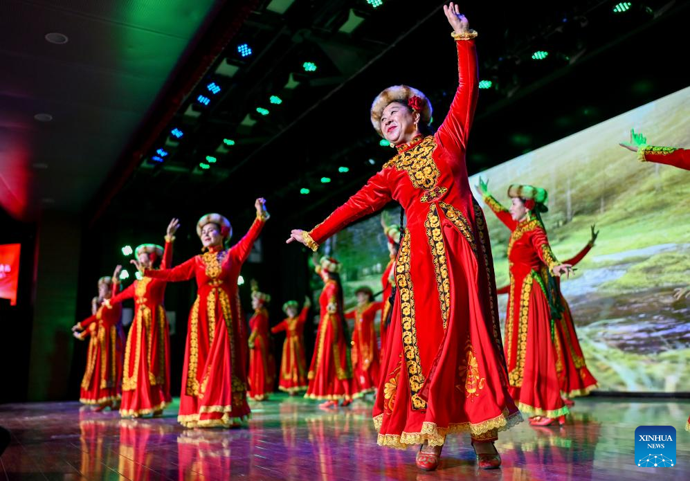 Graduates perform during the graduation ceremony at Xinjiang Open University for Seniors in Urumqi, northwest China's Xinjiang Uygur Autonomous Region, June 27, 2025. A graduation ceremony was held at Xinjiang Open University for Seniors on Friday to celebrate the graduation of its students. The event offered a stage for the elderly students to show their learning achievements, which also attracted their relatives, friends and local residents to take part in with various cultural activities.
