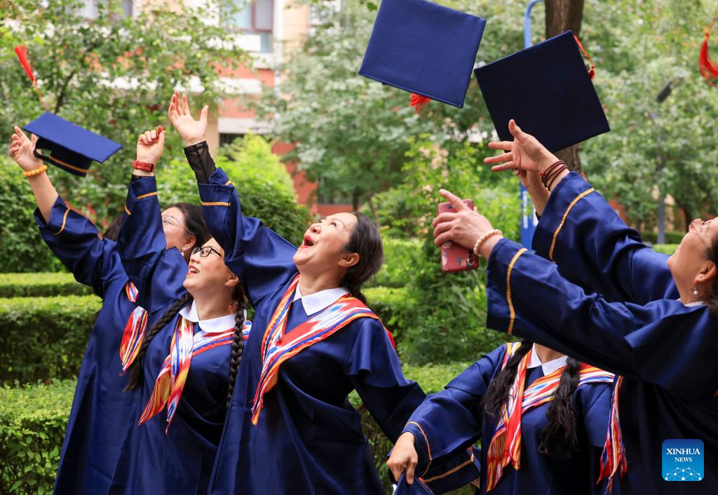 Graduates celebrate by tossing their caps after the graduation ceremony at Xinjiang Open University for Seniors in Urumqi, northwest China's Xinjiang Uygur Autonomous Region, June 27, 2025. A graduation ceremony was held at Xinjiang Open University for Seniors on Friday to celebrate the graduation of its students. The event offered a stage for the elderly students to show their learning achievements, which also attracted their relatives, friends and local residents to take part in with various cultural activities.