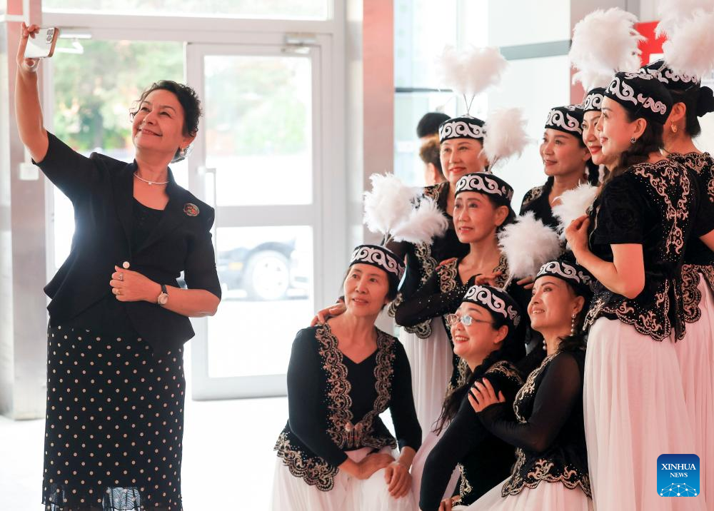 Graduates pose for a group photo with their teacher after the performance at Xinjiang Open University for Seniors in Urumqi, northwest China's Xinjiang Uygur Autonomous Region, June 27, 2025. A graduation ceremony was held at Xinjiang Open University for Seniors on Friday to celebrate the graduation of its students. The event offered a stage for the elderly students to show their learning achievements, which also attracted their relatives, friends and local residents to take part in with various cultural activities.