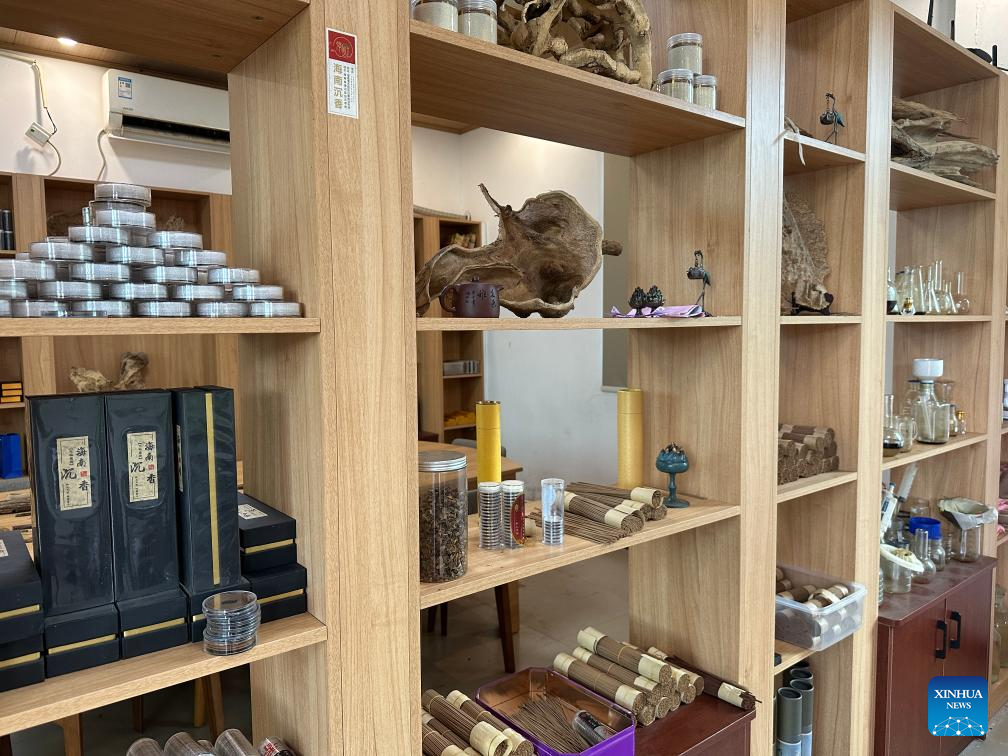 Agarwood products are displayed at a workshop of Hainan Changshu Seedling Development Co., Ltd. in Chengmai County, south China's Hainan Province, on May 27, 2025. (Xinhua/Chen Kaizi)