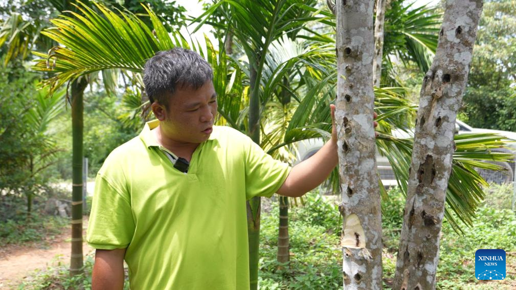 A staff member checks the growth of agarwood trees in Chengmai County, south China's Hainan Province, on May 27, 2025. (Photo by Li Duojiang/Xinhua)
