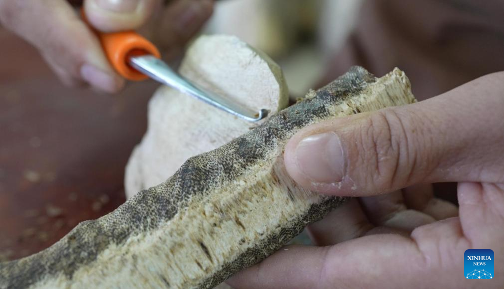 A worker processes agarwood raw material at Hainan Changshu Seedling Development Co., Ltd. in Chengmai County, south China's Hainan Province, on May 27, 2025. (Photo by Li Duojiang/Xinhua)