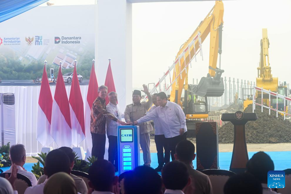 JAKARTA, June 29 (Xinhua) -- Indonesian President Prabowo Subianto on Sunday attended a groundbreaking ceremony for a major electric vehicle (EV) battery megaproject in Karawang, West Java.