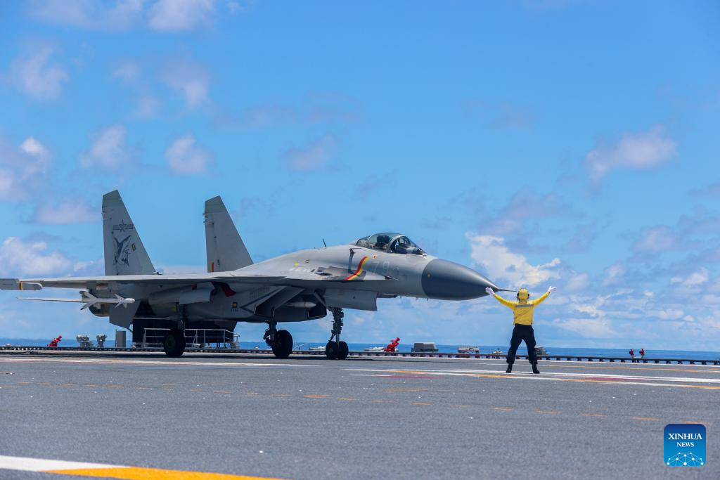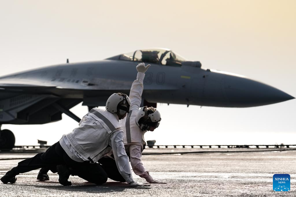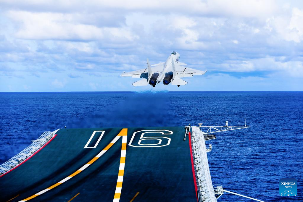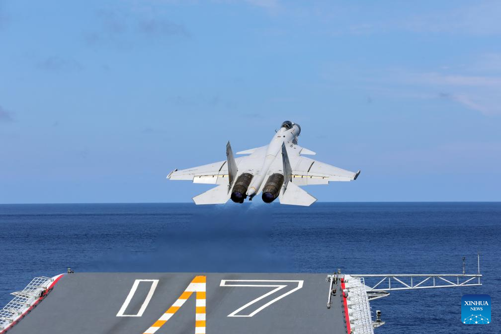 This photo shows a fighter jet preparing to take off from an aircraft carrier. China's naval formations of two aircraft carriers, Liaoning and Shandong, have completed their far-sea combat-oriented training and safely returned to their home ports, according to the Chinese navy on Monday. (Photo by Hu Xiushuai/Xinhua)